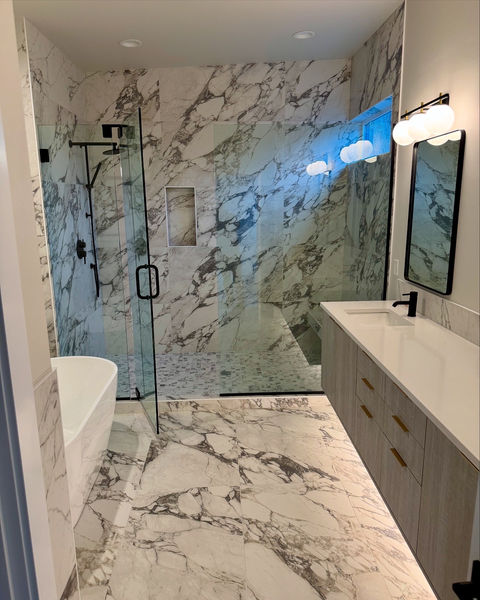 Embrace tranquility as you enter this breathtaking bathroom retreat, where every detail has been designed to promote relaxation and elegance. This stunning space seamlessly combines modern sophistication with the beauty of nature, featuring graceful lines and exquisite marble accents that exude luxury.